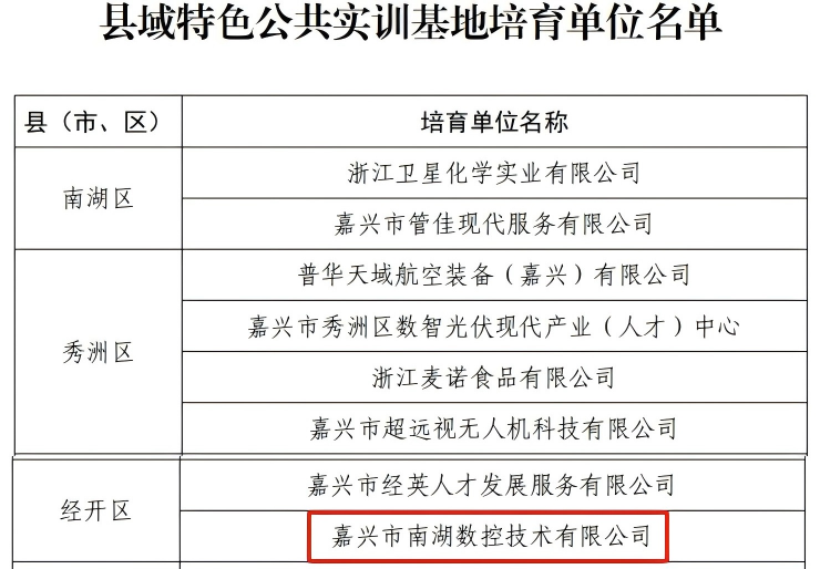 近日,嘉兴市人力资源和社会保障局公布了第二期全市县域特色公共实训基地培育单位名单,嘉兴市南湖数控技术有限公司凭借其在智能制造领域扎实的产业基础和清晰的公共实训基地建设规划成功入选。