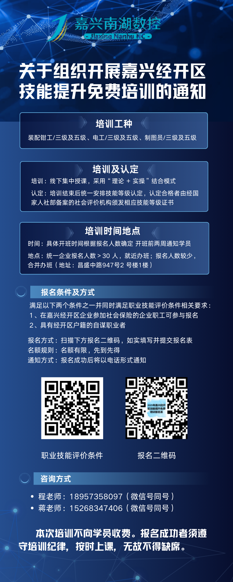 为赋能个人职业发展,助力企业人才储备,由嘉兴经开区经济发展部主办、嘉兴市南湖数控技术有限公司承办的2025年免费技能培训现开放报名。